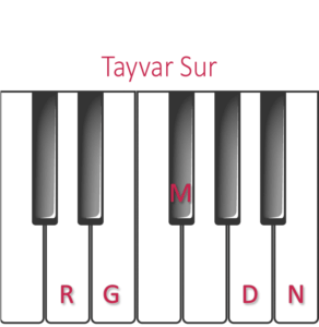 Thirdly, take a look at Tayvar Sur. Notice again, these are NOT lowercase Sur, unlike the Komal Sur. Uppercase is Tayvar and Atal Sur. You really don’t have to think much about Atal Sur, because they’re single. And so there is no room for confusion, whether it’s uppercase or lowercase. Really, any case will work for Atal Sur. I, however, try to keep Atal and Tayvar both uppercase. And yes, there is a black key that is also listed as a Tayvar, deal with it.