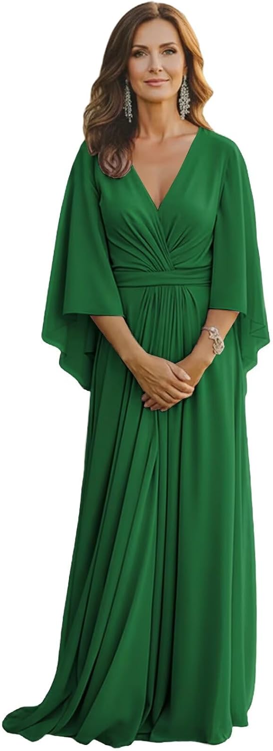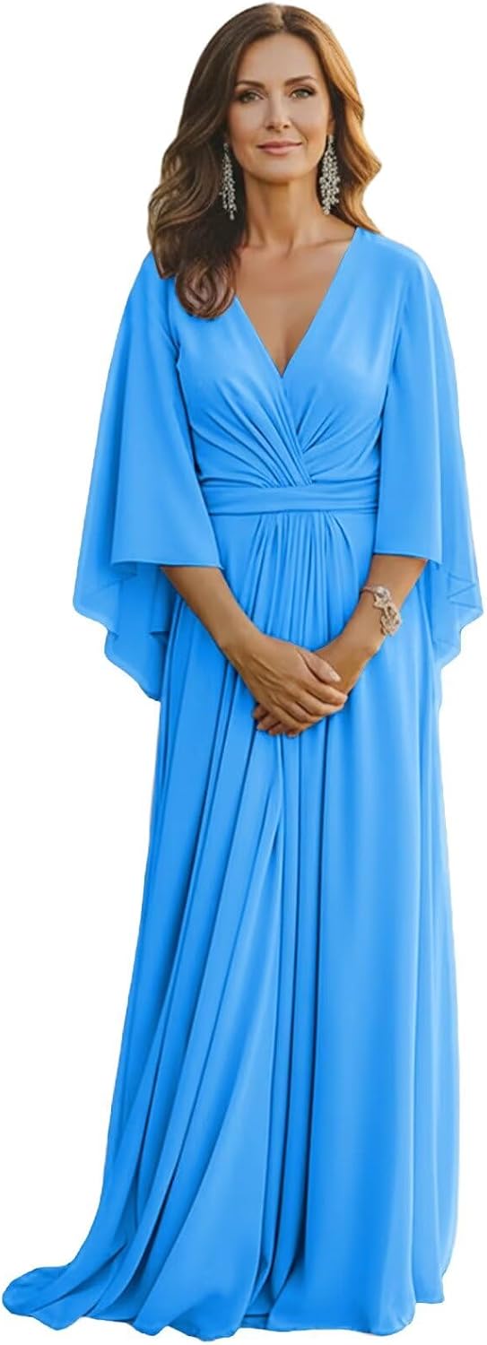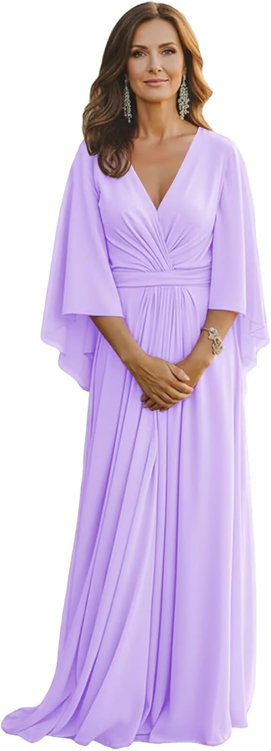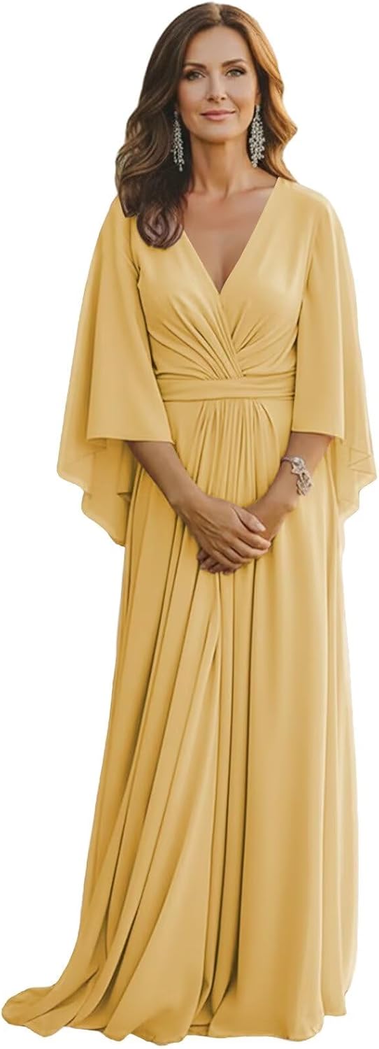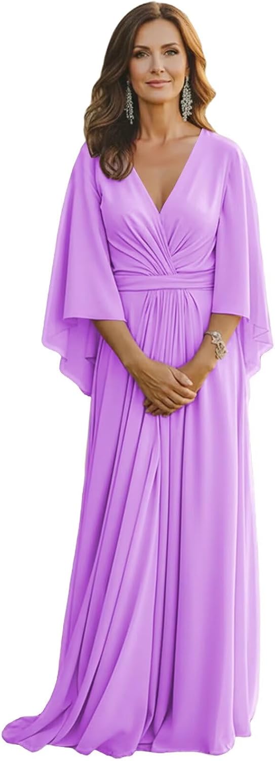 "Design : Long Sleeve Chiffon Mother of the Bride DressesFabric: ChiffonLength: LongSilhouette: A LineNeckline: V NeckSleeve Style: Long SleevesClosure: Zipper BackLong Sleeve Mother of the Bride Dresses Pleated V Neck Mother of the Groom Dresses for WeddingLong Flutter Sleeve Mother of the Bride Gown Pleated Chiffon V Neck Wedding Guest Dresses for GrandmotherChiffon Long Sleeve Grandmother of the Bride Dresses Pleated V Neck Mother of the Bride Gown A Line"