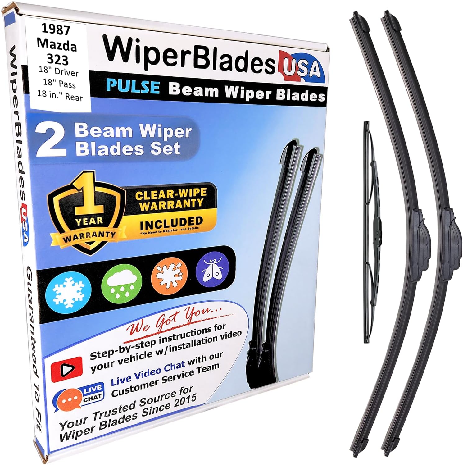 Pulse Beam wiper blades wipers set +Trico ExactFit Rear wiper compatible with Mazda CX-90 2024WiperBladesUSA Beam Wiper Blades - Durable Flexible Beam Blade These WiperBladesUSA® beam wiper blades contour to the curvature of your windshield to provide even wiping pressure along the full length of the blade. These wiper blades have a 1 year Wiper Wear Warranty included. Meaning if they stop keeping you safe you get a credit towards a fresh pair. (See Details) When WiperBladesUSA says "We Got You" we want to make sure you keep good working wipers on your car. Every day. All the time. These beam wiper blades are designed to be compatible with Mazda CX-90 2024 Virtually streak-free visibility Great wipers to have in rain, sleet and snow1 year "Clear-Wipe Warranty"Smooth, chatter-free wipe is a result of the specially blended teflon rubber bladeEnhanced flexibility and grip from the durable, rubber-encased substructureSignificant noise reduction and wind lift through a built-in aerodynamic spoiler to keep the wiper on the windshield at freeway speedsAll weather tough wiper blades with a synthetic rubber squeegee that will withstand even the most extreme weather conditionsPrevents ice and snow build-up through the elimination of exposed metal components. Easy Installation: Included in the bundle are directions (w/video) to simple and easy to use step-by-step installation on to your vehicle