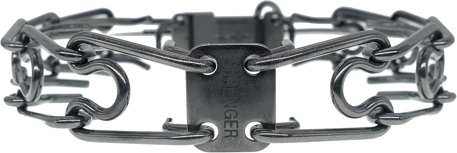 Size:Herm. Sprenger training collar with overall length 23” (58 cm) by 3.2 mm wire gauge. Designed for dogs with the neck size of Up To 20” (51 cm). The manufacturer recommends this collar for dogs weighing up to 88lbs (40 kg). To shorten the collar length, remove links, or use additional individual links to enlarge. Additional links must be purchased separately. Features and Functionality:The Herm Sprenger black prong collar with quick release snap is made from rust resistant stainless steel. The collar features: A solid center plate;D-ring for leash connection;ClicLock buckle.With the proper training, this pinch collar for dogs is a safe and effective behavior correction tool that helps you control and train your dog. Design: Due to symmetrical attachment of the links with the center plate, the collar places even pressure around the neck, pressing the skin in a ring. Additional 2 prongs on each side provides 90% influence on the dog’s neck. This ultra-plus design training collar is a safe and effective alternative to choke collars. Professional Quality:Made in Germany with precise German engineering, reliability, and quality by the world's foremost manufacturer of training prong collars for dogs.